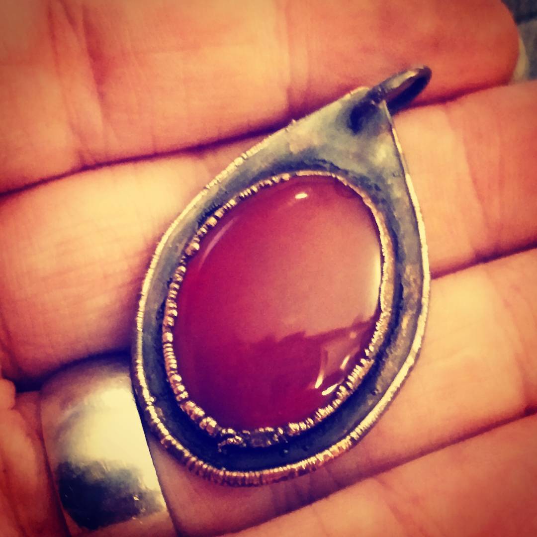 Handmade carnelian pendant with electroformed copper bail.  Approx 2″ long.  Aged finish.