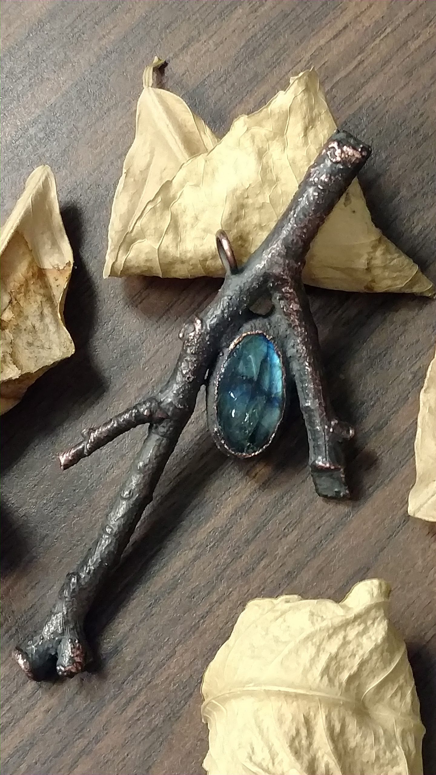 This piece has been aged with an oxidizing solution to permanently change the color of the copper. Over time, and depending on how it’s worn, the colors will continue to change. It has also been coated with a microcrystalline wax polish to protect the metal finish.