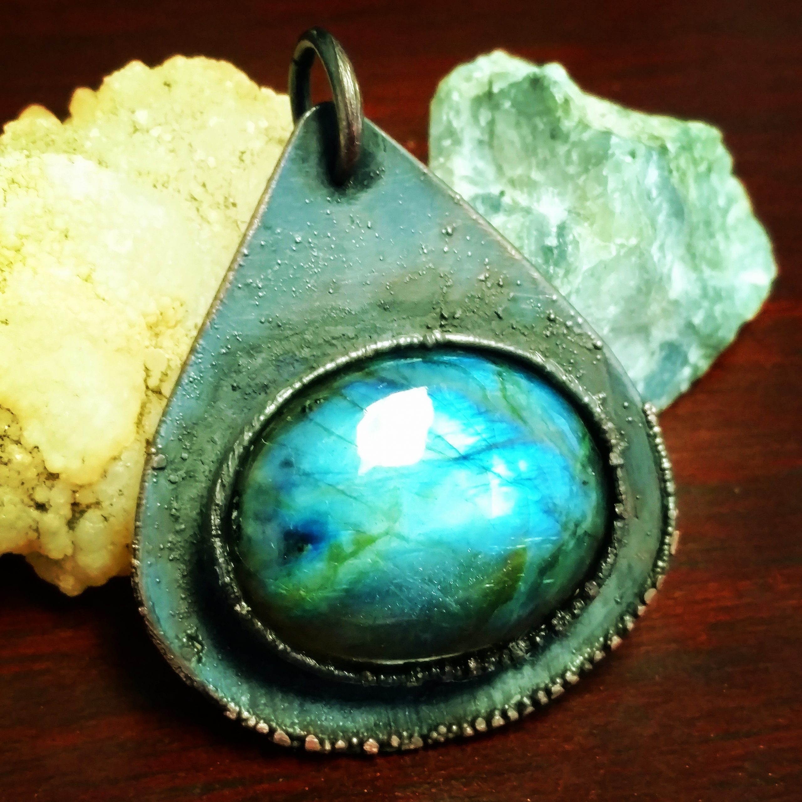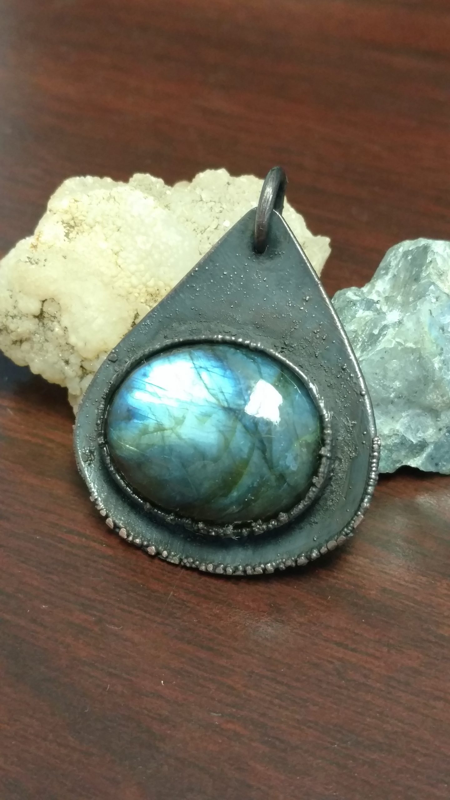 Handmade Labradorite pendant with electroformed copper bail. Approx 1.75″ long and 1.5″ wide. Aged finish.