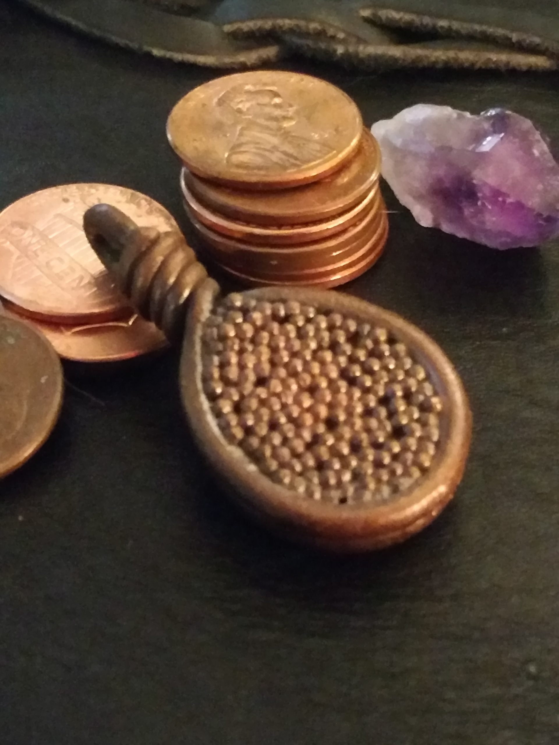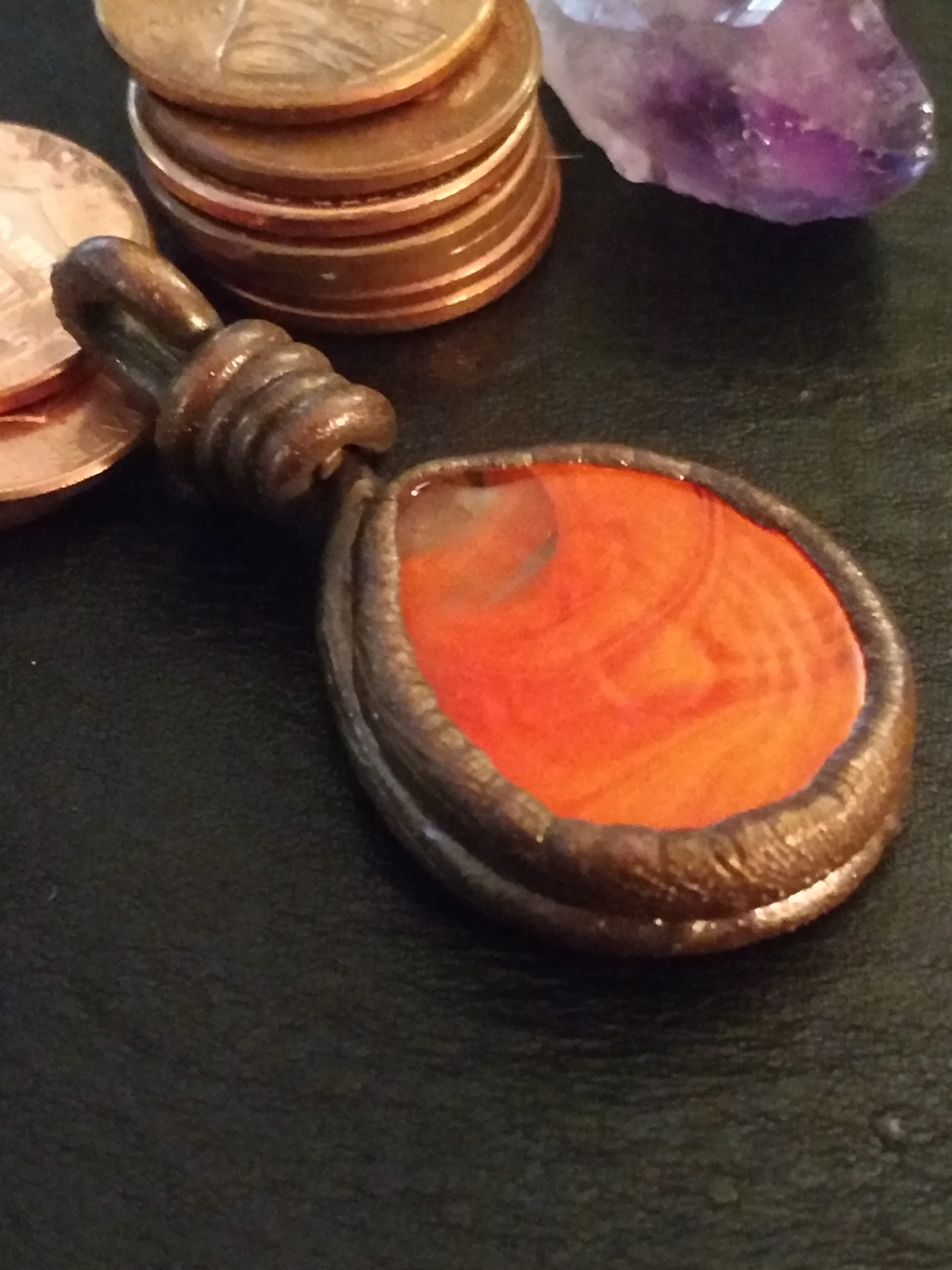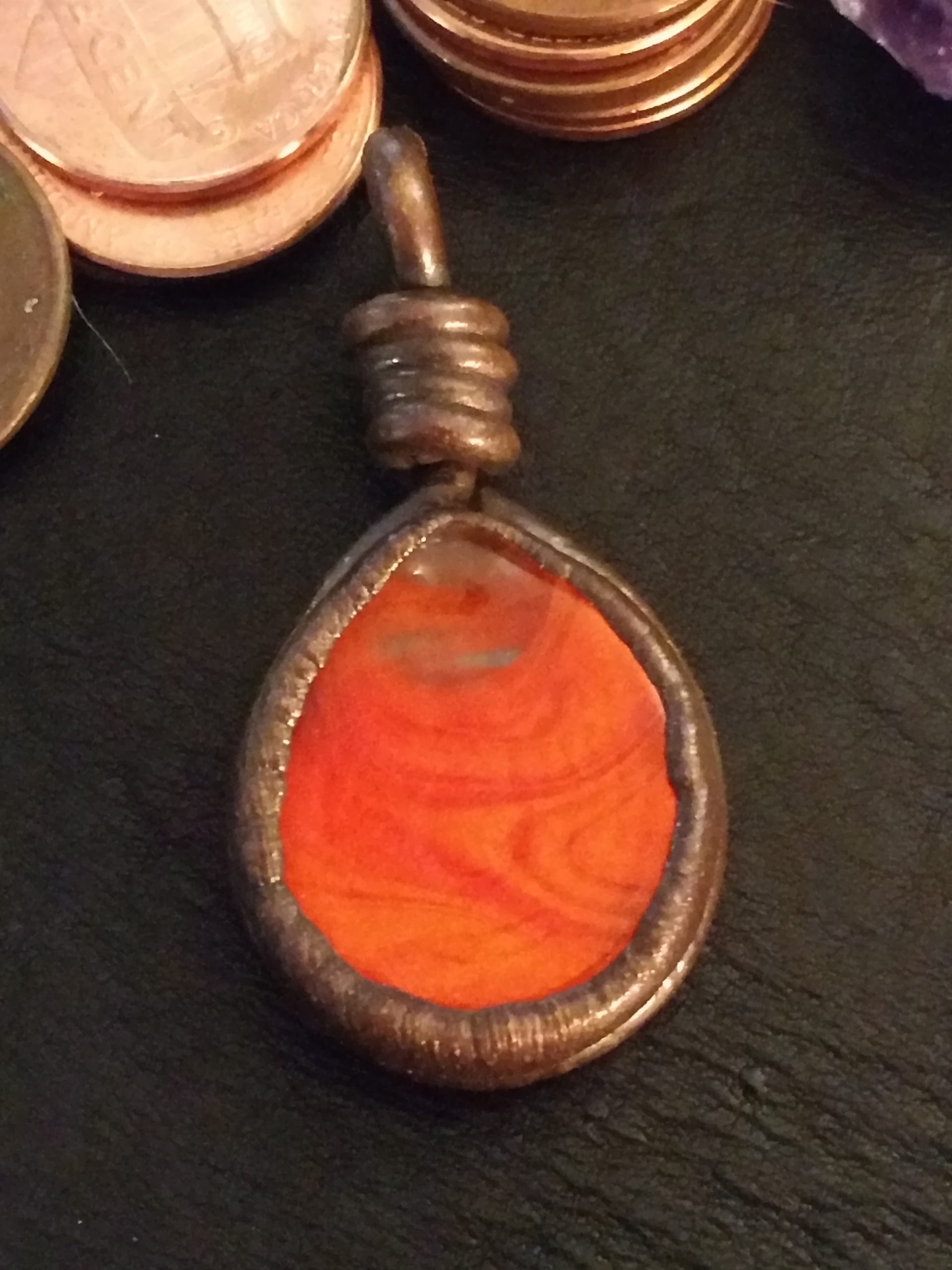 This is a lampwork glass pendant I made, set in Copper with an interesting texture on the back.